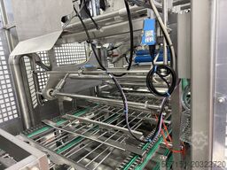 Grunwald flexliner. 3-lane. For denesting trays and hot filling, with 3 x Smartdate X60 printers for film. Sealing 3 at a time. Exiting into single lane. Size of machine is approx. 8 m long x 1.7 m wide with external control panel 1.8 m x 350 mm. All s/s. With one set of tooling for round pot.